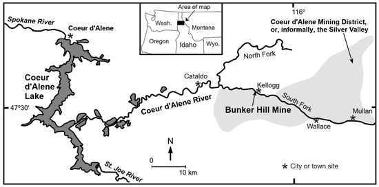 Location of the Bunker Hill Mine in the Coeur d’Alene Mining District in the Coeur d’Alene River Basin, Idaho, USA.