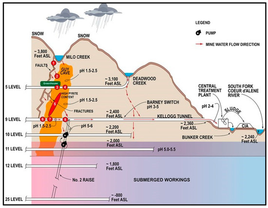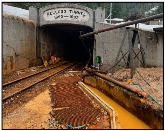 The generation of acid rock drainage (ARD) from abandoned mines can severely impact local and regional water resources [1,2,3]. In the United States, the release of ARD from abandoned mines has led to substantial environmental degradation [4,5,6]. In the Coeur d’Alene Mining District of northern Idaho (Silver Valley), the Bunker Hill Mine (Figure 1) is well known for its argentiferous galena [PbS] and sphalerite [(Zn,Fe)S] deposits. Associated with this ore is a large pyrite [FeS2] deposit (pyritic zone) (Figure 2), which has caused ARD to discharge from the mine since industrial production began in the late 19th century. Infiltrating precipitation from the mountains oxidatively dissolves the pyrite, generates acid, mobilizes metals and sulfur, and discharges from the mine’s main portal (Kellogg Tunnel, Figure 2 and Figure 3) [7]. The ARD exiting the mine portal requires continuous collection and treatment at a water treatment plant in the adjacent town of Kellogg (Figure 1). The University of Idaho and the new mine owner (Bunker Hill Mining Corporation) formed a university–industry partnership to evaluate the sources, flowpaths, and travel times of the mine water through analysis of the stable and radiogenic isotopes of the water (δ2H, δ18O, and 3H) to provide relevant information for targeting surface and subsurface areas for infiltration reduction. The application of the isotope tracers to this mine water issue is in response to prior hydraulic and solute tracer studies [7,8] that have been unable to fully resolve the source waters responsible for the ARD.