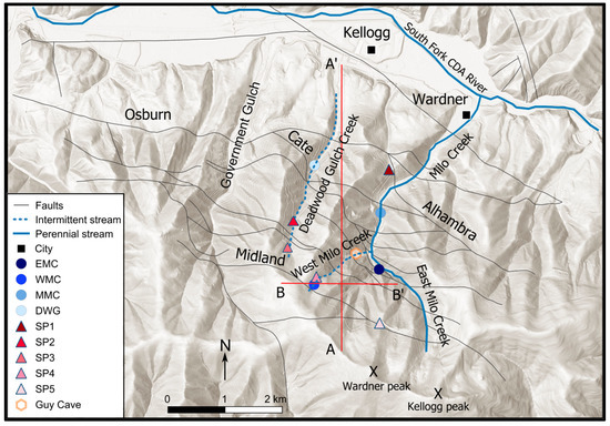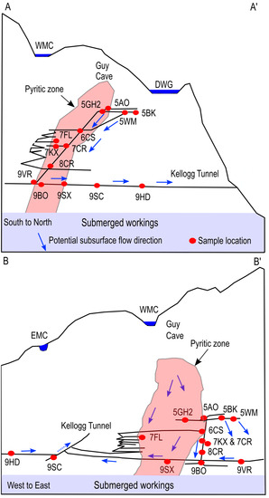 Simplified cross-sections (A−A′, B−B′ in Figure 4) of the mine workings depicting key features including the pyritic zone (position inferred), Guy Cave, overlying creeks, and potential flowpaths between levels and sites. West Milo Creek, East Milo Creek, and Deadwood Gulch are represented as WMC, EMC, and DWG, respectively. Adapted from Germon et al. [8] and LiDAR imaging of mine workings provided by Bunker Hill Mining Corporation.