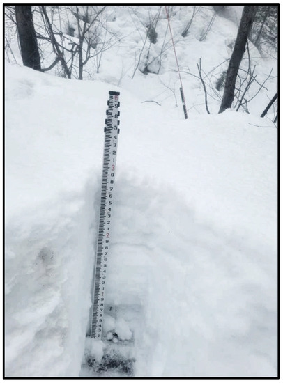 Five snow sites (SP1–5 with respective elevations of 1015, 1198, 1338, 1460, and 1543 m NAVD 88, Figure 4) in the Milo Creek and Deadwood Gulch watersheds (aligned along the access road to Wardner Peak) were sampled from December 2021 to May 2022. Snow sampling sites were chosen to minimize the collection of disturbed snow as well as snow redistributed by canopy throughfall and slumping from the upgradient snowpack. Snow sampling consisted of the collection of a composite (top to base of the snowpack) and base layer (bottom 0.15 m of the snowpack) sample at each site to evaluate the isotopic differences by elevation and within the snowpack (base layer as potential snowmelt indicator). For the collection of the composite and base layer samples during shallower snowpacks (<1.5 m), the samples were collected by trenching and scraping the open face with a trowel (Figure 6). During deeper snowpacks, an adjustable-length, 7.5-cm diameter, aluminum coring device was used to collect snow samples through the insertion of the coring device from the top to base of the snowpack. All snow samples were vacuum sealed in 1-L bags and returned to the mine laboratory, where the samples were placed in an oven at approximately 25 °C. Following the melting of the snow samples in the sealed bags, the resulting water was syringe filtered (1 μm) into 125 mL (δ2H and δ18O) and 500 mL (3H) HDPE containers (no headspace) and sealed with polyseal caps.