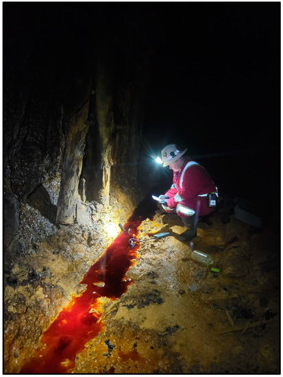 Fourteen mine water sampling sites were established on the mine’s 5 to 9 levels (Figure 2) that encompass the upper pyritic zone (no access to the levels above the 5 Level). The mine water sites are referenced by their level (first numeral) and stope description (2–3 alphanumeric) (Table 1). The mine water samples were collected from drainages in the stopes (Figure 7) as unfiltered, depth-integrated samples in 125 mL (δ2H and δ18O) and 500 mL (3H) HDPE containers (no headspace) and sealed with polyseal caps. Due to site access restrictions, sites 5WM and 5BK were incorporated into the sampling two months after the start of sampling and site 7KX after the first month. Access to 5AO was suspended near the end of the study due to mine restart activities.