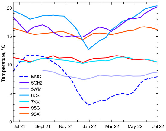 Lowess trend lines of water temperature at Milo Creek (MMC) and select mine water sampling sites on the 5, 6, 7, and 9 levels of the mine.