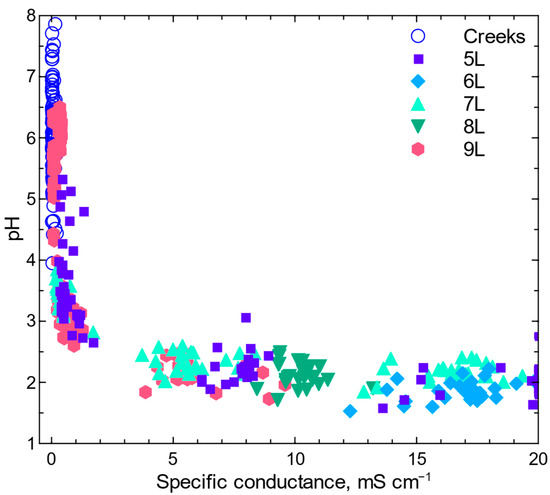 The pH and specific conductance of mine water substantially varied by sample site because of the differences in flowpaths that intersected, or did not intersect, the pyritic zone (Figure 9). Mine water sites 5GH2, 6CS, and 7FL contained the poorest water quality with pH ranging from 1.5 to 2.8 and specific conductance ranging from 10 to 20 mS cm−1. Site 9SX contained water with lower specific conductance values (4 to 10 mS cm−1) but acidic conditions (pH of 1.7 to 2.5). Sites containing water with pH > 3 and specific conductance values < 2 mS cm−1 (5WM, 5BK, 7KX, 9SC, 9VR, 9BO, and 9HD) appear to have flowpaths that do not substantially intersect the pyritic zone and more closely resemble the creek water conditions (pH > 5, <1 mS cm−1). The break in water quality associated with water at pH near 3 aligns with strong acid generation during the oxidation of pyrite and the increased mobility of metals, such as Fe and Mn, with pH < 3.5 and oxic/hypoxic conditions (5-Level mine water contained 1.5 to 9 mg/L O2) [59]. Sites 9SC and 9HD contained water of relatively good quality (pH > 6, specific conductance < 1 mS cm−1) similar to surface waters, which indicate source water pathways that are isolated from mine workings and the pyritic zone until emergence on the 9 Level.