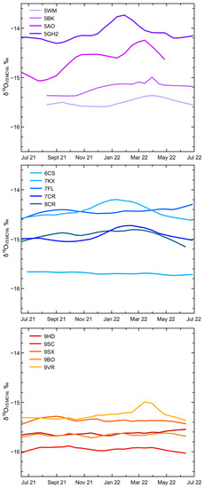 Lowess trend lines of mine water δ18O values (grouped by mine level). Data missing from 5AO, 5WM, and 5BK because of limited accessibility.