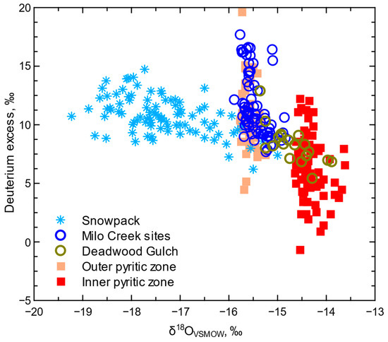 Distribution of deuterium excess and δ18O for snowpack composite and basal layer samples (“Snowpack”), Deadwood Gulch and Milo Creek (MMC, EMC, and WMC) samples, mine water with dominant sources outside of the pyritic zone (outer pyritic zone sites of 5WM and 7KX), and mine water from the inner pyritic zone (5GH2, 6CS, and 7FL).