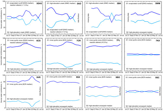 Lowess trend lines of source water contributions for select mine water sites derived from two-component (S1 and S2) unmixing of observed δ18O values.
