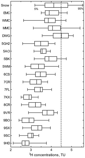 - Michel, R.L.; Jurgens, B.C.; Young, M.B. Tritium Deposition in Precipitation in the United States, 1953–2012; Scientific Investigations Report 2018–5086; U.S. Geological Survey: Reston, VA, USA, 2018; p. 19. [CrossRef]