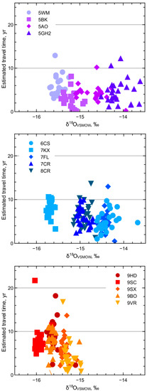 Estimated travel time and δ18O of mine water sites.