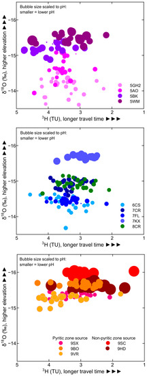Tritium concentrations, δ18O values, and pH for mine water sampling sites on each level with discrimination of sites in proximity or distant from the pyritic zone.