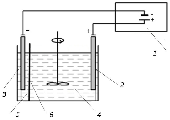 Electrochemical reactor. 1-DC source, 2-anode, 3-cathode, 4-anodic compartment (V = 150 mL), 5-cathodic compartment (V = 50 mL), 6-cation exchange membrane.