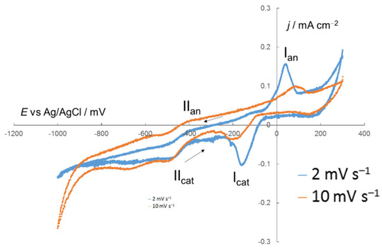 Cyclic voltammograms in solution of nitrafurazone (26.7 mg L−1) obtained by dissolving Avexima® in 0.01 M H2SO4. Numbers I and II correspond to the redox transitions of nitrafurazone in the cathodic region of potentials (cat—redox transitons on the cathodic scans of CVs, an—redox transitions on the anodic scans of CVs). See comments in the text.