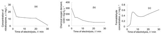 Nitrofurazone concentration (a), COD (b), and formaldehyde concentration (c) in the course of electrolysis using Pt/Ti anodes. See comments in the text.