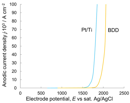 Potentiodynamic (v = 1 mV s−1) oxygen evolution polarization curves on Pt/Ti and BDD electrodes in 0.5 M H2SO4.