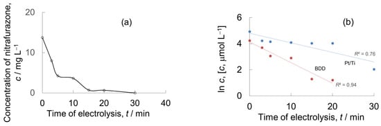 Experiments on the electrochemical oxidation of nitrofurazone have shown that the efficiency of the BDD anode is much higher compared to the Pt/Ti anode. The concentration of nitrofurazone dropped to zero in the first half an hour of electrolysis; therefore, the degree of its destruction was about 100% (Figure 6a). This conclusion was confirmed by the residual COD (18.0 mg O2 L−1) and TOC (<1 mg L−1) values (Table 2 and Table 3).