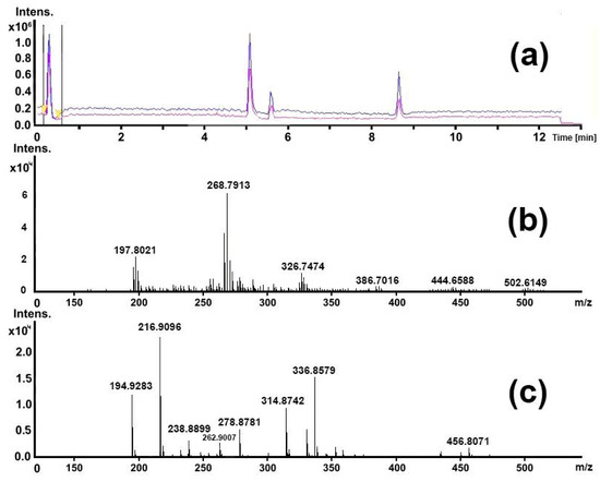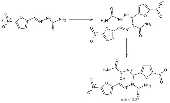 Since nitrofurazone is an electron acceptor, the spectrum of nitrofurazone was observed in negative ions at a retention time of 0.3–0.5 min (Figure 7a,b).