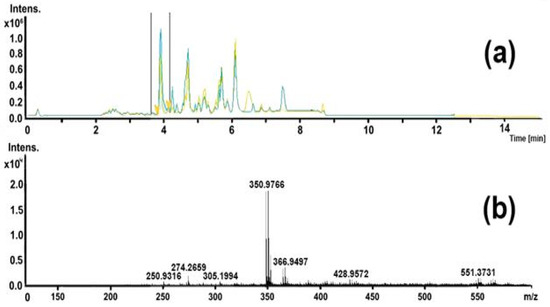 Chromatogram and mass spectrum (tR = 3.9–4.0 min) (a,b) after 5 min of electrochemical treatment (BDD anode) in positive ions.