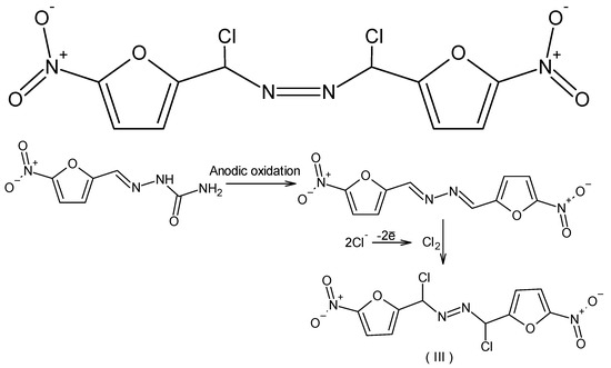 The addition of the products of chlorine to 5-nitro-2-furaldehyde azine was formed in the solution under electrochemical treatment in the first minutes (0–15 min) of electrolysis. Almost complete mineralization of organic pollutants occurred after ca. 30 min of electrolysis using BDD anodes. Therefore, electrochemical treatment for 30 min can be recommended for the mineralization of nitrofurazone.