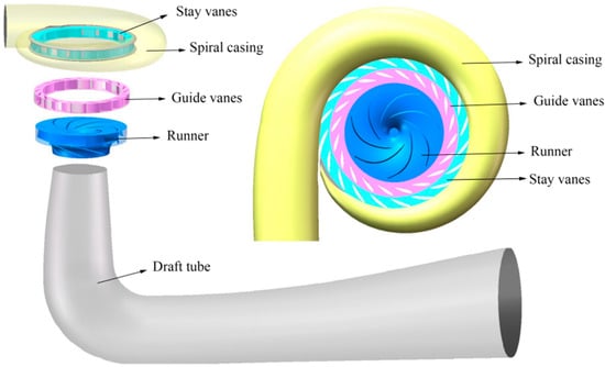 The research object was a Francis turbine. The three-dimensional fluid domain model of the full-flow channel of the Francis turbine is shown in Figure 1.