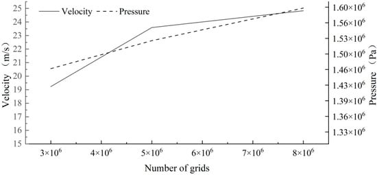 Grid division was the most important step in the numerical simulation of hydraulic turbines, and the quality of the grid directly affected the accuracy of the results. In this paper, the spiral casing and runner were divided nonstructurally, and the stay vane, guide vane, and draft tube were divided structurally. The Schemes A, B, and C were designed for grid independence testing. The corresponding grid numbers for schemes A, B, and C were 3 million, 5 million, and 8 million, respectively. The characteristics of different grids is summarized in Table 2. The skewness was considered to be better closer to 0, while orthogonal quality was considered to be better closer to 1. From Table 2, it can be seen that the grid quality of Scheme B was better. The average pressure value of the runner blade pressure surface and the average flow velocity value of the turbine outlet section were compared and analyzed. As shown in Figure 2, the flow velocity was 19 m/s and the pressure was 1.43 × 106 pa when the number of grids was 3 million. The flow velocity was 23 m/s and the pressure was 1.56 × 106 pa when the number of grids was 5 million. The flow velocity was 24 m/s and the pressure was 1.60 × 106 pa when the number of grids was 8 million. The difference in flow velocity and pressure between 5 million and 8 million grids was 4.2% and 2.5%, respectively. This means that the sensitivity of the simulation results to the number of grids decreased. From the perspective of computational efficiency and cost, this paper selected scheme B as the computational grid. In order to verify the rationality of the results near the wall, the y+ value near the wall was measured. The average y+ value on the blade wall of Scheme B was 38. According to [], a y+ value of less than 50 can also achieve good results when using Large-Eddy Simulation. The results near the wall can be considered reasonable. Figure 3 shows the details of grid division.