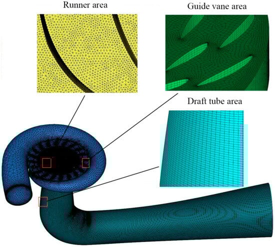The runner in the 3D fluid domain model was rotating with the movement of the water, and it was set to the rotating domain. The spiral casing, stay vane, guide vane, and draft tube were set as stationary.