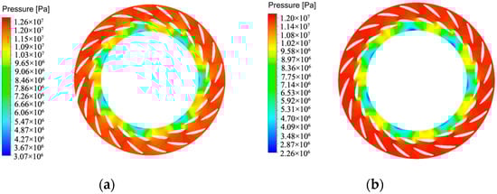 As shown in Figure 9a, the highest pressure position was located at the blade head, which was approximately 1.5 × 107 Pa. The suction surface pressure of the blade was lower than the pressure surface in most areas. It was in a negative pressure state, and the fluctuation was not very obvious. There were only some areas where the pressure was higher than the pressure surface at the water outlet edge and the middle position of the blade. The pressure difference between the pressure and suction surfaces of the runner blades gradually increased from the outlet to the inlet. The cavitation phenomenon at the head of the runner blade was stronger than that at the tail of the blade. This is because the water flow from the guide vane impacted the pressure surface of the runner blade at a large angle of attack, and it led to local high pressure at the head of the blade pressure surface.