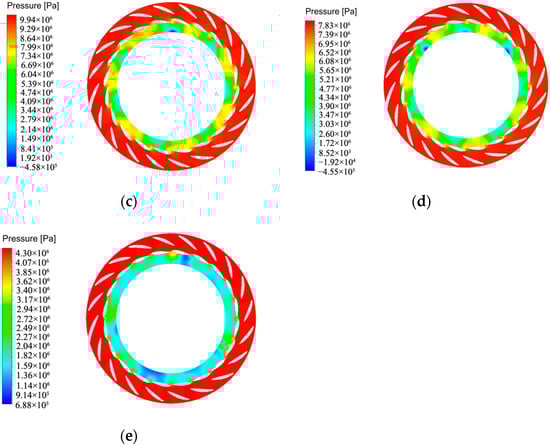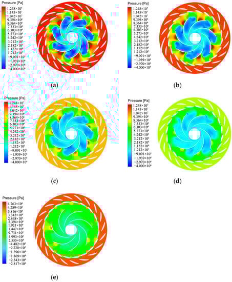 Pressure cloud map of the center section of the runner: (a) Pressure cloud map of the center section of the runner at 100%Pn. (b) Pressure cloud map of the center section of the runner at 75%Pn. (c) Pressure cloud map of the center section of the runner at 50%Pn. (d) Pressure cloud map of the center section of the runner at 25%Pn. (e) Pressure cloud map of the center section of the runner at 1%Pn.
