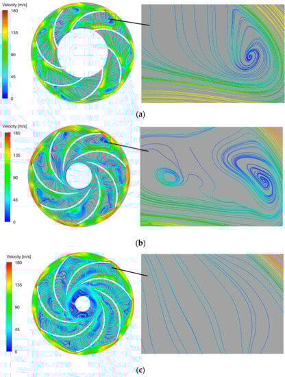 It can be seen in Figure 6a that a distinct channel vortex was generated in the head area of the blade channel. The opening of the guide vane was relatively small, and the water flow impacted the runner blades at a relatively large angle of attack. Flow separation occurred in the water flow, and it formed two parts of the water flow. A part of the water flowed along one side of the blade suction surface towards the tail of the blade channel. Another part of the water flow broke free from the constraints of the blades under the action of uneven protrusions on the surface of the blades. This indicated that the detachment phenomenon had occurred, and vortex structures were created in the blade channel. The effect of channel vortices consumed most of the kinetic energy of the water flow, a low-speed region was generated in the channel vortex region, and some water flow velocities were even 0 m/s. It can be seen in Figure 6b that the vortex structure increased, the vortex area increased, and the water flowed from the head of the blade channel to the tail. The low-speed area in the middle of the blade channel also increased under the action of the blade channel vortex. The vortex structure compressed water flow, water flowed laterally at both the head and tail of the blade channel, and it generated greater head loss. It can be seen in Figure 6c that there was no obvious vortex structure at the head of the blade channel, and it was mainly concentrated in the tail area of the blade channel. The transverse flow area was distributed across the entire blade channel, and it caused severe head loss. The efficiency of the water turbine decreased.