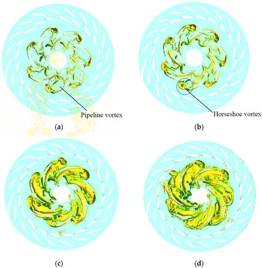 The vortex core diagram is shown in Figure 7. The vortex structures under different working conditions were symmetrically distributed in the circumferential direction. The flow pattern in the guide vane area was stable. Only small-scale vortex structures were generated at the head of the guide vane. Vortex structures of different sizes and shapes appeared between the runner blade flow channels. The pressure difference between the pressure surface and suction surface caused the water flow into the middle of the blade, and the water flow formed a flow separation at the leading edge of the blade and flowed into the blade channel along the front and back sides of the blade. The detachment and flow separation were generated under the action of uneven protrusions on the surface of the blade, which led to the formation of vortex structures in the middle of the blade channel, such as pipeline vortices between the blades.