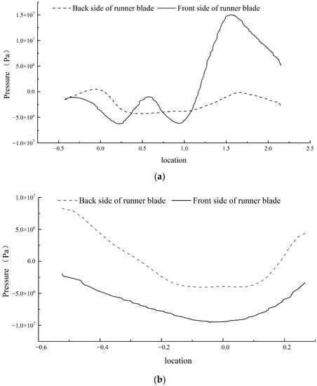 Pressure distribution diagram of the front and back of the runner blade: (a) horizontal linear pressure distribution diagram and (b) vertical linear pressure distribution diagram.