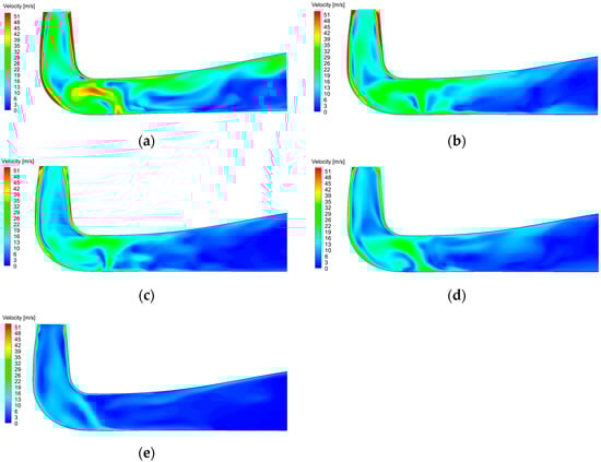 The flow velocity diagram of the draft tube under different guide vane openings is shown in Figure 10. The flow from the runner impacted the draft tube wall with a large circumferential velocity. The velocity on the side wall of draft tube was greater than that in the center of draft tube. The maximum flow velocity area on the sidewall accounted for the largest proportion at 100% working condition. It extended from the straight cone section sidewall to the curved elbow section sidewall, and the maximum flow velocity was 51 m/s. The decrease in inlet flow rate led a gradual decrease in the flow velocity on the side wall of the straight cone section of the draft tube as the opening decreased. The maximum flow velocity area was mainly concentrated on the edge wall of the straight cone section at 50% working condition. There was almost no maximum flow velocity region on the side wall of the elbow section. The maximum flow velocity region only existed on the inlet wall of the draft tube as the opening further decreased.