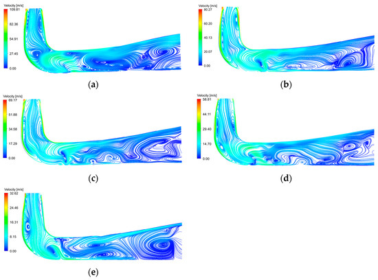 The streamline diagram of the draft tube is shown in Figure 11. The streamline distribution was different under different working conditions. The vortex structure appeared in the straight cone section, which was caused by the low flow velocity in the center of the draft tube, and it caused the water flow to converge inward. The flow pattern in the elbow section was relatively stable, and there was no obvious vortex structure. In the diffusion section, the upper water flow streamline was evenly distributed, and vortex structures of varying sizes appeared in the lower part. The reason is due to the flow velocity in the diffusion section being nonuniform, which led to backflow in the draft tube. The flow left above the draft tube collided with the flow returning from the draft tube outlet at the lower part of the diffuser. This caused flow separation and formed a vortex structure. The vortex structure at 1% working condition was the most obvious.