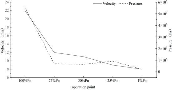 The maximum velocity and pressure distribution diagram at the opening section of the draft tube under different openings is presented in Figure 12. The pattern of change was the same. The working conditions decreased, and the opening of the guide vanes decreased accordingly. The inlet flow rate decreased, and the flow rate decreased accordingly. The minimum flow rate was at 1% working condition, which was 8 m/s. The smaller the working condition, the smaller the draft tube outlet pressure. The maximum pressure was concentrated near the draft tube wall.
