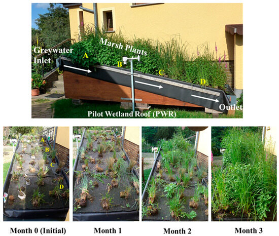 A number of GW treatment and reuse schemes have already been implemented worldwide using both conventional and hybrid systems [12]. To make the experimental operation, monitoring, and maintenance easier, only a strip of wooden structure was used at ground level to demonstrate the PWR system in this study. Based on the treatment performance of the PWR, the potential application of such a system on a real roof for GW treatment on a household basis and the reuse of the treated effluent for irrigation purposes in a backyard garden is feasible and optimistic. Therefore, the application of such a constructed WR system can be on the roofs of residential houses, office buildings, school premises, hotels, etc. for treating GW in urban development as well as for passive cooling and habitat preservation. Where the roof statics may be critical for conventional green roofs, the low loads of such constructed wetland roofs due to the absence of sand or gravel (presence of a recycled synthetic fiber mat only) as water storage and plant carrier mat are of further advantage for the subsequent greening of existing buildings [40,70].