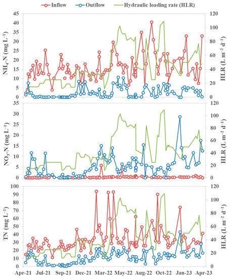 Figure 3. The dynamics of NH4-N, NO3-N, and TN concentrations in the inflow and outflow of the PWR system observed under different HLRs.