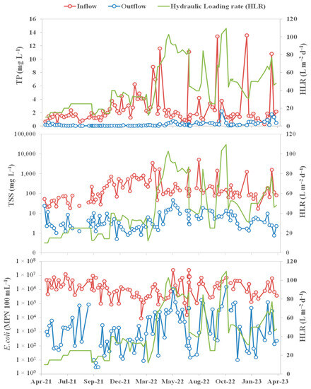 Figure 4. TP, TSS concentrations, and E. coli were counted in the greywater inflow and outflow of the PWR system with increasing HLRs.