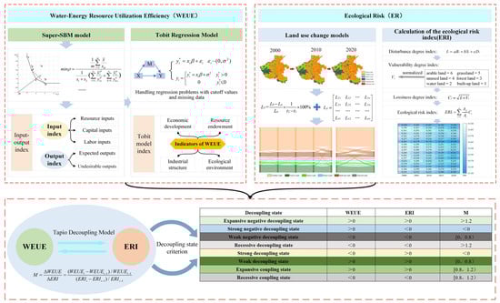 The Assessment-Decoupling two-stage framework is shown in Figure 1. WEUE was measured by the Super-SBM model, and the influencing factors of WEUE were comprehensively considered from four aspects with the application of the Tobit regression model. ER is evaluated based on land-use data from a raster perspective. Then, the Tapio model was used to identify the fitness relationship between the above two aspects.