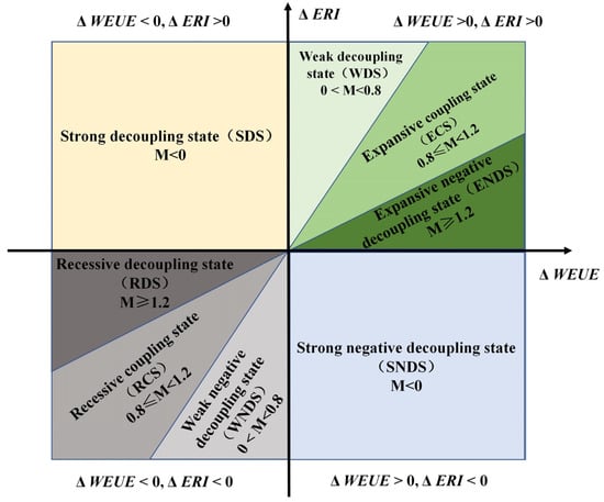 where M is the decoupling index of WEUE and ERI, respectively, which is used to quantify the degree of decoupling between WEUE and ERI; ΔWEUE and ΔERI are the change rates of WEUE and ERI in a certain period; WEUEi−1 and ERIi−1 are WEUE and ERI at the beginning of the period; WEUEi and ERIi are WEUE and ERI at the end of the period. Referring to the existing research, the definition criteria of the decoupling states were determined (Figure 2), in which the strong negative decoupling state (SNDS) is the best one.