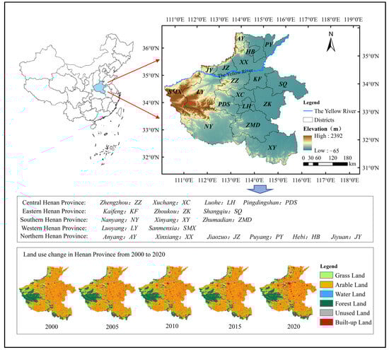 Taking 2000–2020 as the study period, total water consumption was obtained from the Water Resources Bulletin of Henan Province (https://slt.henan.gov.cn/bmzl/szygl/szygb/ (accessed on 24 July 2023)). Land-use data with a spatial resolution of 1 km was acquired from the Resource and Environment Science and Data Center (https://www.resdc.cn/ (accessed on 25 July 2023)). Data on energy consumption and per capita energy production came from the China Energy Statistics Yearbook (http://www.stats.gov.cn/sj/ndsj/ (accessed on 25 July 2023)). Data on per capita water resources, the proportion of secondary industry, the proportion of agricultural water consumption, sewage treatment rate, chemical oxygen demand emission, gross domestic product, and investment in fixed assets were from the Henan Province Statistical Yearbook (https://tjj.henan.gov.cn/tjfw/tjcbw/tjnj/ (accessed on 26 July 2023)). Data on indicators such as the end-of-year area practitioners, regional gross domestic product, sewage discharge, and CO2 emissions for cities in Henan Province were obtained from the statistical yearbooks of each prefecture-level administrative region.