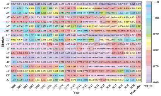 The obtained WEUEs of 18 districts in Henan Province from 2000 to 2020 are shown in Figure 4. From the perspective of time, the WEUE of all districts in Henan Province showed fluctuating changes from 2000 to 2020, experiencing the process of “decreasing-rising-decreasing-rising”, and the overall development basically presented a “W”-shaped trend. The maximum value of WEUE (1.115) occurred in Xuchang in 2014, and the minimum value (0.615) occurred in Jiyuan in 2004. The top three districts in terms of WEUE are Zhoukou, Xuchang, and Nanyang, whose 20-year average WEUE are 0.971, 0.939, and 0.915, respectively. The last three districts are Xinxiang, Hebi, and Jiyuan, whose 20-year average values are 0.707, 0.650, and 0.645, respectively. From the changes in WEUE during the study period, it could be seen (Figure 5) that there was a significant difference among districts in the study area. The WEUE of Kaifeng, Anyang, and Zhumadian decreased most significantly, by 0.262, 0.252, and 0.214, respectively. Pingdingshan, Nanyang, Zhoukou, and Jiyuan were all lowered to varying degrees, and the WEUE of the remaining districts were raised to varying degrees, with Luoyang raising the highest (0.207), followed by Xuchang (0.168).