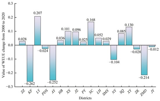 Changes in WEUE of 18 districts from 2000 to 2020.