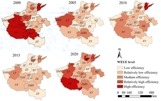 In this study, the natural discontinuity grading method was used to classify the WEUE of districts in Henan Province into five levels from low to high: low efficiency, relatively low efficiency, medium efficiency, relatively high efficiency, and high efficiency. The levels of WEUE were spatially visualized with a time step of 5 years and a time cross-section of the years 2000, 2005, 2010, 2015, and 2020, as shown in Figure 6.