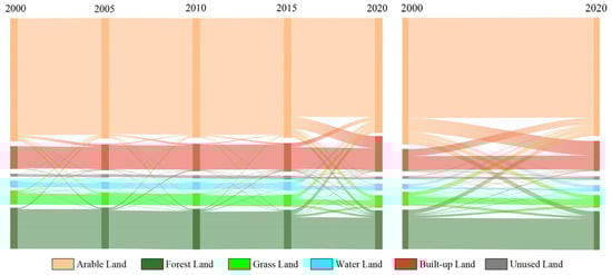 By referring to Table 4, it became evident that during the period from 2000 to 2020, there were notable variations in the areas of different land-use types within Henan Province. The consistent structure throughout this period was characterized by arable land, with it being the largest, followed by forest land, built-up land, grass land, water land, and unused land. Arable land and forest land were the primary land-use categories in Henan Province, making up approximately 80% of the total land area. Conversely, the extent of unused land was found to be less than 0.1%. During the study period, the largest change in the area was arable land, which decreased by 4990 km2. With a time window width of 5 years, arable land decreased by 2942 km2 during 2015–2020, accounting for 59% of the total decrease in arable land. Followed by built-up land, which increased by 4821 km2 from 2000 to 2020, and built-up land increased by 3191 km2 during 2015–2020, accounting for 66% of the total increase in built-up area of land use. The maximum value of the dynamic index for the six land use types occurred in the period of 2015–2020 in the case of build-up land with 3.43%, followed by water land with 2.66% for the period of 2000–2005. Forest land had the smallest value of change in the dynamic index, with a minimum value of 0.01%, followed by water land with a minimum value of 2.66%, and grass land with 0.02%. Land use transfers by phase from 2000–2020 are shown in Figure 7. It could be noticed that during the period of the study, the main focus was on the transfer of arable land and built-up land. Between 2000 and 2015, the interconversion of different land uses was relatively negligible. However, the most substantial change in land use occurred from 2015 to 2020, particularly with a substantial conversion of arable land into built-up land. Simultaneously, there was a notable conversion of arable land to forest land, grass land, water land, and unused land. Additionally, there was a transfer of built-up land back to arable land, although the extent of this transfer was considerably smaller compared to the conversion from arable land to built-up land.
