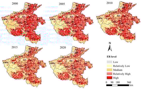 Utilizing the Ordinary Kriging approach, the spatial interpolation of the ERI was conducted for the 8417 evaluation grid cells within the designated study area. Through ArcGIS data processing, it was found that the range of the ERI for the five periods was all within 0–0.326. In order to facilitate the comparison of the spatial distribution of ER in five periods in the study area, the ERI for each period was divided into five classes based on the relative index method. The divisions were as follows: high ER (>0.25), relatively high ER (0.2–0.25), medium ER (0.15–0.2), relatively low ER (0.1–0.15), and low ER (<0.1). Figure 8 displays the mapping of spatial and temporal variations in ER across the five-time periods.