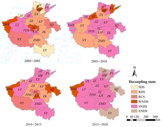 Considering that the land-use data have a period of 5 years, in order to reflect the real state of the study period as much as possible, the calculation of the decoupling index was carried out with a window width of 5 years (except for the first and last years). Then, the decoupling state of the whole study period was studied.