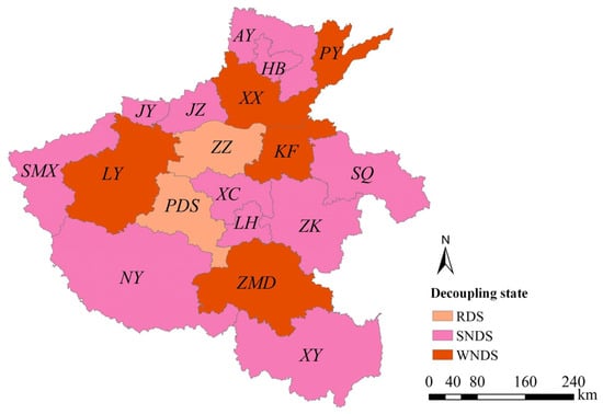 The decoupling state with a window width of 5 years is shown in Figure 10. It could be found that the decoupling state between WEUE and ERI in Henan Province had more obvious distributional characteristics. In the period of 2000–2005, there were two main states of SNDS and RDS, as well as three other states of decoupling: SDS, WNDS, and RCS. The areas of SNDS were mainly distributed in central and western Henan, and the areas of RDS were mainly distributed in northern and eastern Henan. In the period of 2005–2010, the districts with SNDS increased significantly, mainly distributed in the central and eastern Henan areas, and the areas with RDS shifted to the western and southern Henan areas. In the 2010–2015 time breadth, the number of districts with SNDS declined and shifted mainly to the north and south of Henan, and the districts with RDS were mainly concentrated in the districts of central Henan and east Henan. In the 2015–2020 time broadcast, decoupling states were divided into three main states: SNDS, ENDS, and WNDS, which were primarily dominated by SNDS, with a total of 14 districts. The district with WNDS was Sanmenxia, and the districts with ENDS were Anyang, Xinxiang, and Shangqiu. The spatial distribution of the decoupling states of WEUE and ERI for the whole study period is shown in Figure 11. It mainly showed three kinds of decoupling states: SNDS, WNDS, and RDS. Xinyang, Puyang, Kaifeng, Luoyang, and Zhumadian were RDS; Zhengzhou and Pingdingshan were WNDS; and the other districts were SNDS.