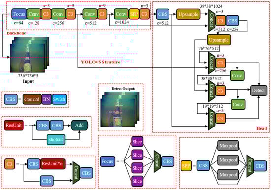 After the second classification of the subsea pipeline images, this section carried out specific event target detection for images with events, determining the type of event and its position and size in the image. The timely discovery of conventional and abnormal events is very important for the normal operation and maintenance of the subsea pipelines despite challenges such as image blurring and events that are too large or too small. Target detection is divided into an anchor-based method and anchor-free method []. The anchor-based method views target detection as a problem of classification and regression of candidate region, and it is divided into a one-stage method and two-stage method. The one-stage method has a faster detection speed and the two-stage method has better detection accuracy. Anchor-free technology abandons anchor and completes the detection by determining the key points. This greatly reduces the number of network hyper parameters, but causes an unstable detection effect. In order to balance the detection speed and detection effect, this study selected the one-stage YOLO end-to-end training target detection model. Manual judgment and identification of events such as sundries, suspended pipelines, anodes and nodes with ROV video images consumes a lot of manpower and material resources, and also reduces the efficiency of the operation. In addition, deep-sea images have low definition, and there are many kinds of subsea pipeline events with different sizes. Both manual detection and traditional detection methods have low efficiency and low accuracy. Therefore, building an efficient and accurate detection system based on artificial intelligence is very important. The YOLO algorithm uses a separate CNN model to achieve end-to-end target detection. The detailed parameters and operation processes tested in this study are shown in Figure 2.