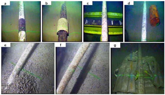 Types of subsea pipeline events: (a) field joint, (b) anode, (c) sleeper, (d) debris, (e) gravel, (f) free span and (g) sandbag.