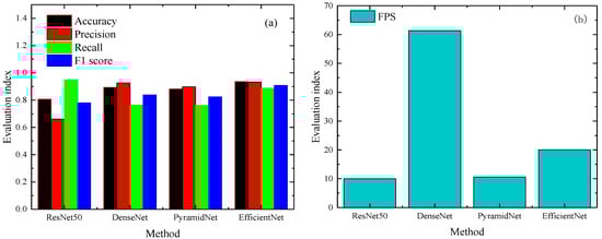 Evaluation metrics of model performance in the classification of subsea pipeline images. FPS was used to evaluate the speed of object detection. (a) Results of accuracy, Precision, Recall and F1score index and (b) result of FPS.
