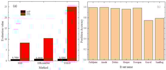 Evaluation of mode performance in event detection with subsea pipeline images and results for (a) Map and FPS index and (b) Prediction accuracy.