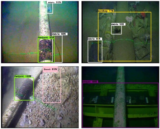 The YOLO method’s detection results are shown in Figure 6. When compared with the other methods, it achieved an mAP value of 0.9242 and reached 25 FPS, which were the best results, showing that YOLO can be the optimum choice for the detection of subsea pipeline events. For several events such as nodes, anodes, sundries, supports and hanging submarine pipeline, YOLO gave good results, especially for the detection of field joint, anode, debris, sleeper and free span, where its detection accuracy was over 0.95. However, Yolo only had detection accuracies of 0.7453 for gravel and 0.7883 for sandbag. However, overall, the YOLO method showed significant potential for determining the status of pipelines in the complex environment of the seabed.